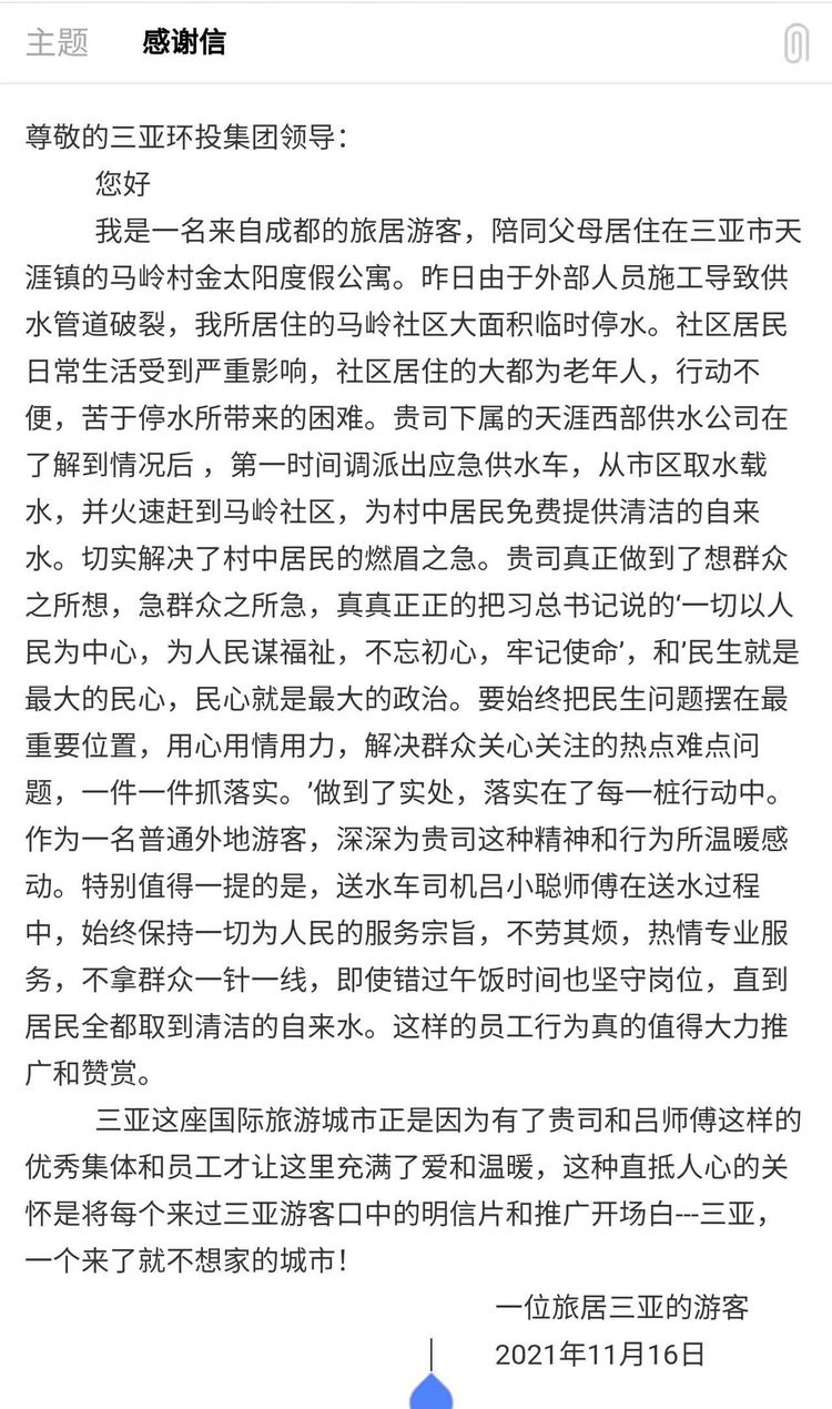 11月17日,三亞環(huán)投集團(tuán)接到了一封署名為“一位旅居三亞的游客”的感謝信,來(lái)自成都的游客張女士在信中真摯講述了我司向馬嶺社區(qū)應(yīng)急送水、解群眾燃眉之急的事情,并熱情洋溢地贊揚(yáng)了西部供水公司以及送水車司機(jī)呂小聰?shù)娜娜鉃槿嗣穹?wù)的崇高品格。張女士表示,這件暖心小事不僅令她感動(dòng),更讓他感受到了三亞這座城市的民生溫度。