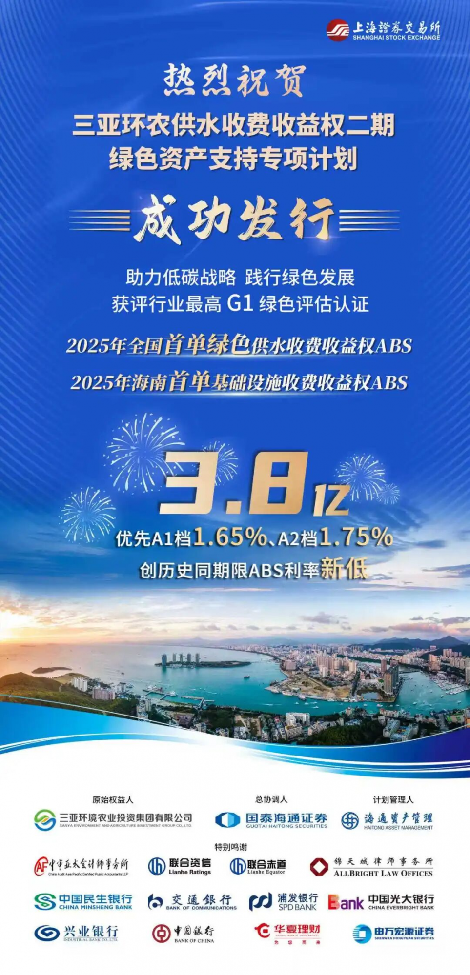 9月18日,三亞環(huán)農(nóng)集團(tuán)成功發(fā)行2025年全國首單綠色供水收費收益權(quán)ABS與2025年海南首單基礎(chǔ)設(shè)施收費權(quán)益權(quán)ABS,實現(xiàn)了業(yè)務(wù)領(lǐng)域的重要突破。近日,該項目憑借卓越的創(chuàng)新性與示范價值,一舉斬獲中國金融前沿論壇(CFAF)2025年度三大重磅提名: